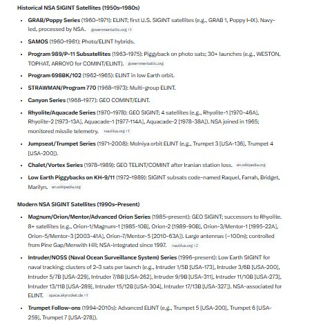 Chinese Signals: Adapted for Sino-Soviet monitoring, including air-defense radars, missile R&D, and satellite operations. Satellites like Mentor target high-value Eurasian signals, with 85% COMINT focus.