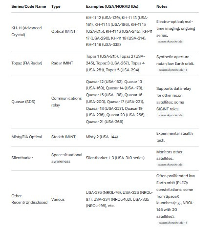 The National Reconnaissance Office (NRO) is responsible for designing, building, launching, and operating U.S. reconnaissance satellites, many of which are classified. Known programs and satellites have been declassified over time or identified through observations, leaks, and official releases. These include imagery intelligence (IMINT), signals intelligence (SIGINT), and other types. Below is a non-exhaustive list of major known NRO satellite series and specific examples, drawn from historical and current sources. Note that many recent NROL (NRO Launch) missions have undisclosed payloads, but some are inferred based on orbits and patterns.Historical NRO Satellites (Pre-1990s, Mostly Declassified)