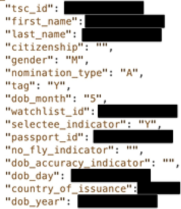 Found by Bob Diachenko in 2021. Note that every name is assigned unique numbers “tsc_id” and “watchlist_id”