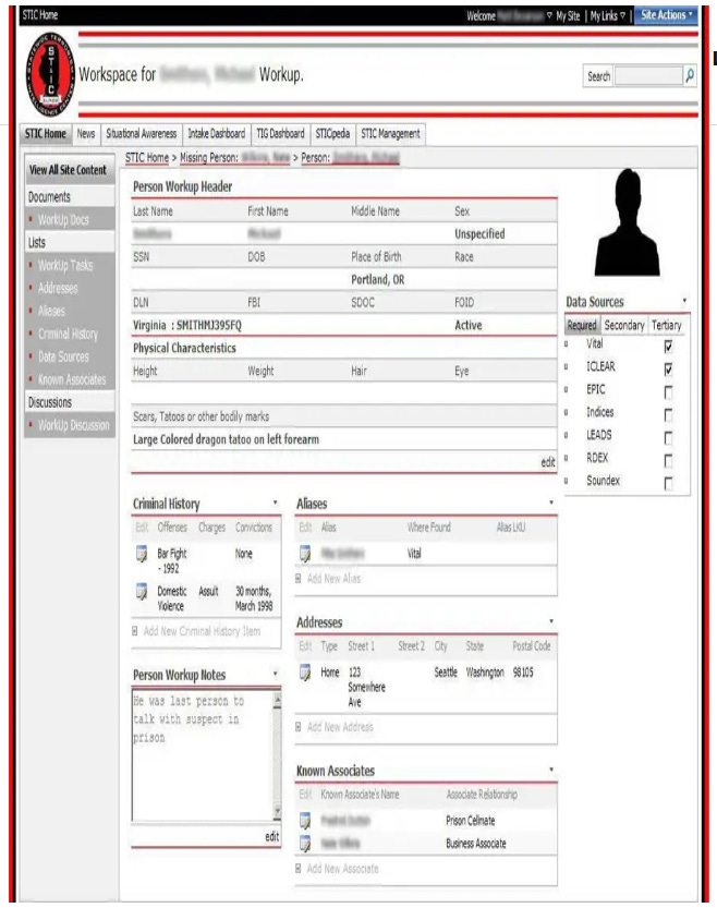 An example record in the Illinois Fusion Center called the Statewide Terrorism & Intelligence Center (STIC). Most of the information comes from the FBI’s Terrorist Screening Database (TSDB) which is updated and distributed everyday through the National Crime Information Center (NCIC).